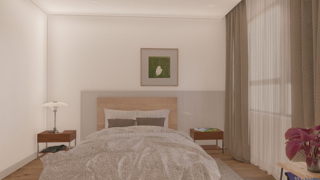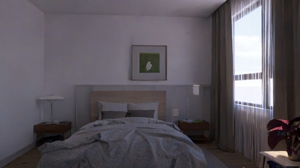 Si inizia con un rendering della camera da letto usando la pipeline di rendering Rasterization e utilizzando gli effetti Reaslitic Styles.